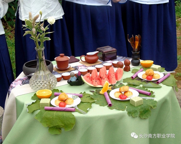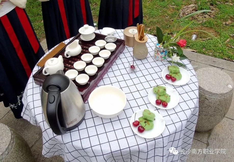 2018年6月,基础教学部文综教研室主任尹文偈老师在学院环形教学楼喷泉处举办了别开生面的室外公开课——《中国传统技艺——茶艺》。此次开设茶艺课程并展示的专业为航空服务系高铁乘务专业,主题为茶席的设计并辅以茶艺、茶韵的展示。同时,学院督导、系部领导受邀出席。