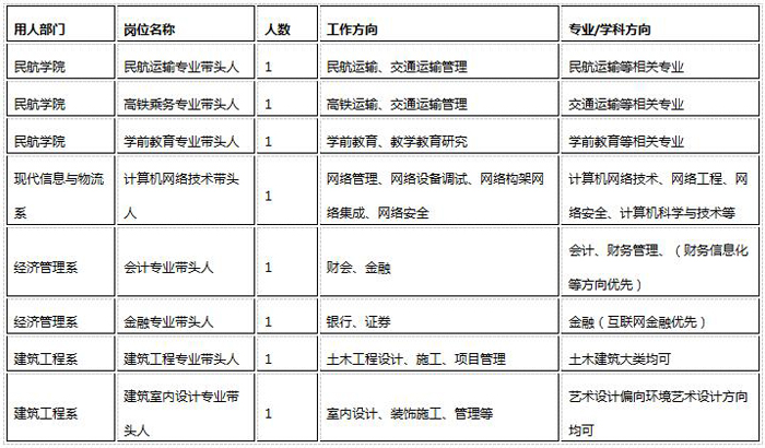 1.专职教师:要求硕士(全日制)及以上学历,专业成绩优异,对口专业毕业,热爱教育事业,语言表达流畅,有较强的亲和力,愿意长期从事高职教育,有三年以上教学工作经验或行业工作经验的适当放宽学历要求。