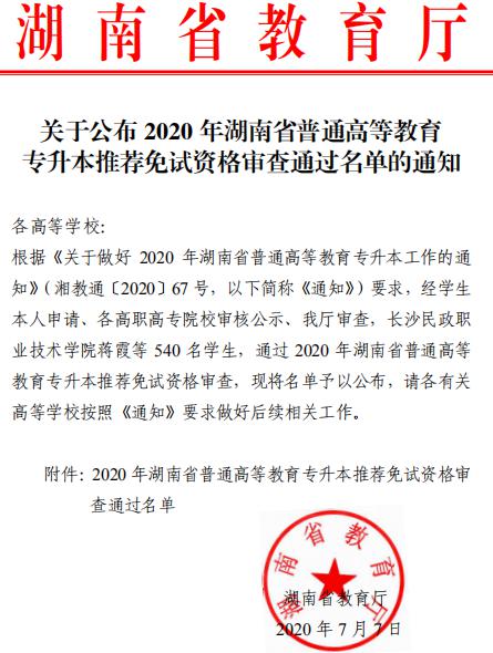 在2020年湖南省普通高等教育专升本推荐免试资格审查通过名单中,我院现代信息与物流系软件技术专业的贺志龙和电子商务专业的阳定同学审查通过,获免试资格。