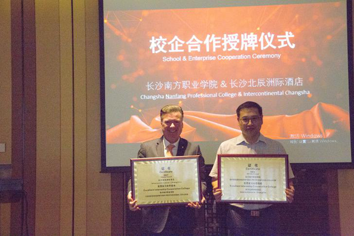 会议在热烈隆重的气氛中开始,首先长沙洲际酒店总经理Grant Thompson致辞,对学院的到来表示热烈的欢迎,对学院的学生综合素养和实践能力予以了肯定,酒店的未来发展会需要更多人才,需要更多方式深化合作。学院的肖晓春院长就深化校企合作做了重要的发言,指出校企合作是职业教育的基本办学模式、是办好职业教育的关键所在,是培养培养技能型人才的重要方式,希望开展多方位、多层次、多领域的合作共同培养出更多的人才。随后双方举行了授牌仪式,在人才培养、资源利用等方面不断探索和拓宽校企合作的新途径,切实为学院和行业的发展做出应有的贡献,不断探索出更多新的合作模式。