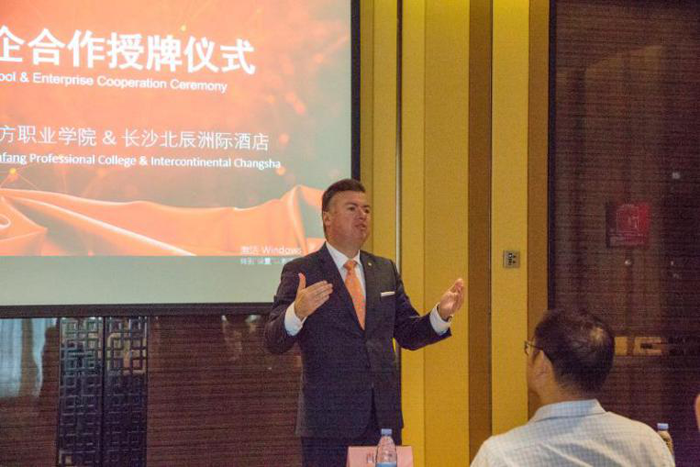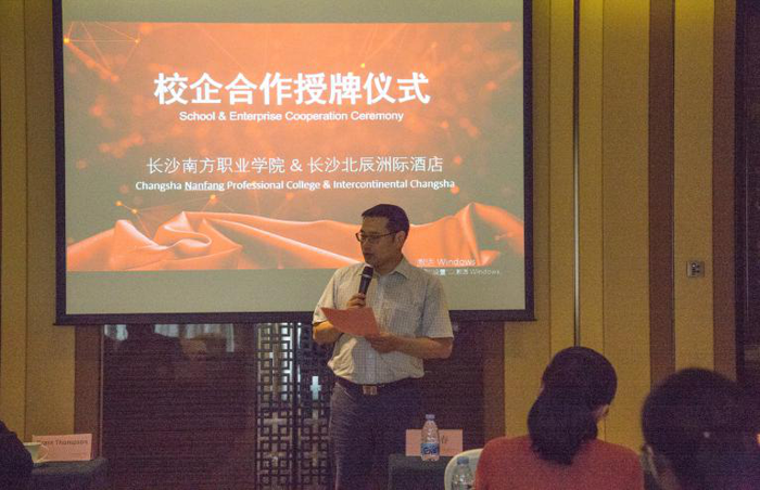 最后,长沙洲际酒店的人力总监徐云飞就酒店行业的发展前景做了专题报告。希望加强学校与企业的合作双方互相支持、互相渗透、优势互补、资源互用、利益共享的作用,最终实现学校、学生、企业三方共赢的目标。