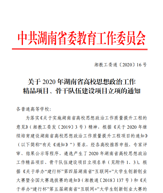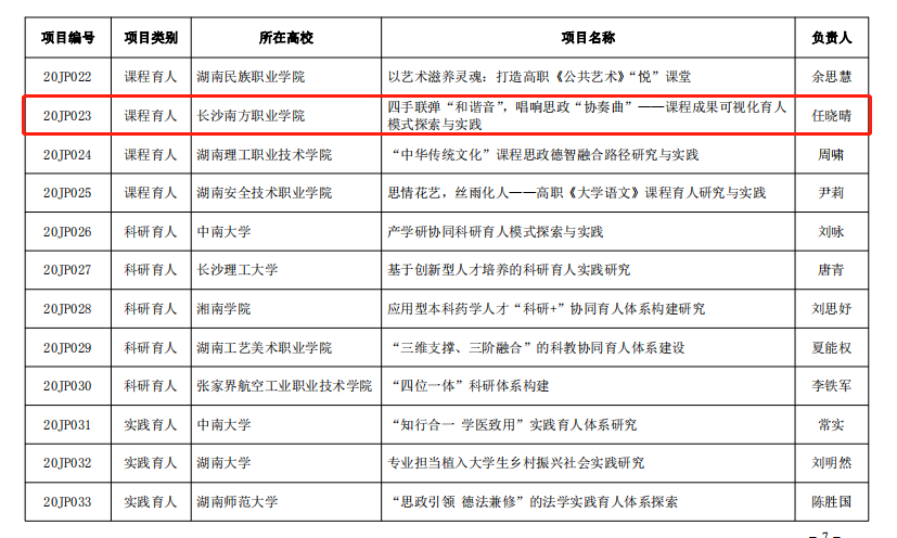 近日,长沙南方职业学院科研项目立项又传佳音!任晓晴书记《四手联弹“和谐音”,唱响思政“协奏曲”——课程成果可视化育人模式探索与实践》课程育人项目,在2020年湖南省高校思想政治工作精品项目、骨干队伍建设项目申报中,喜获立项!