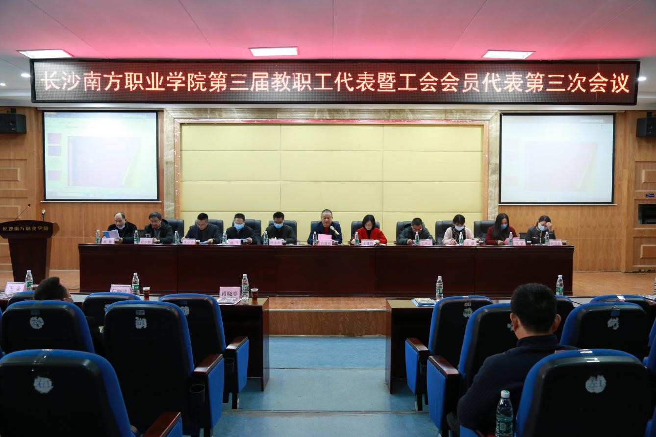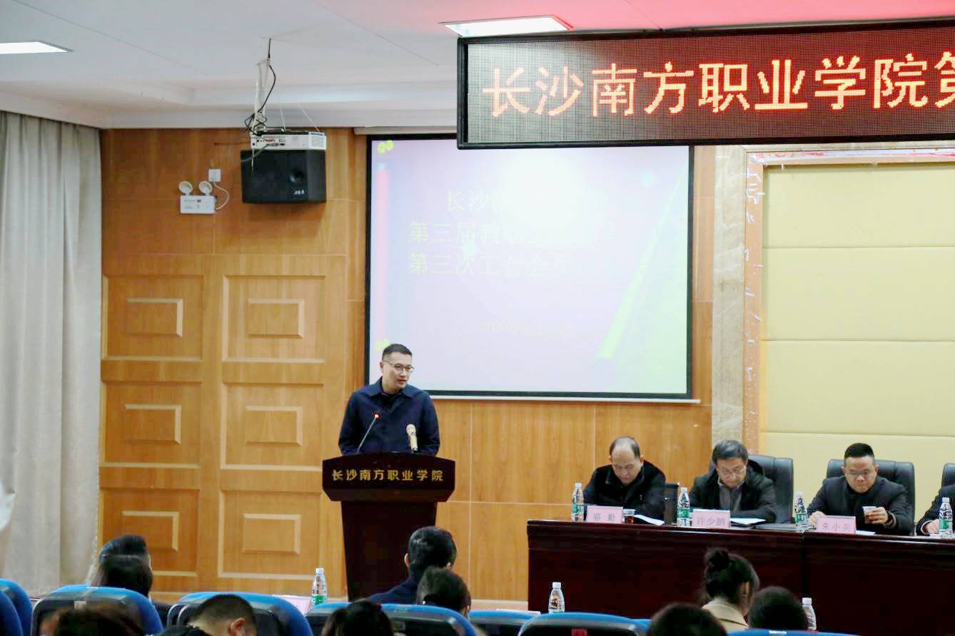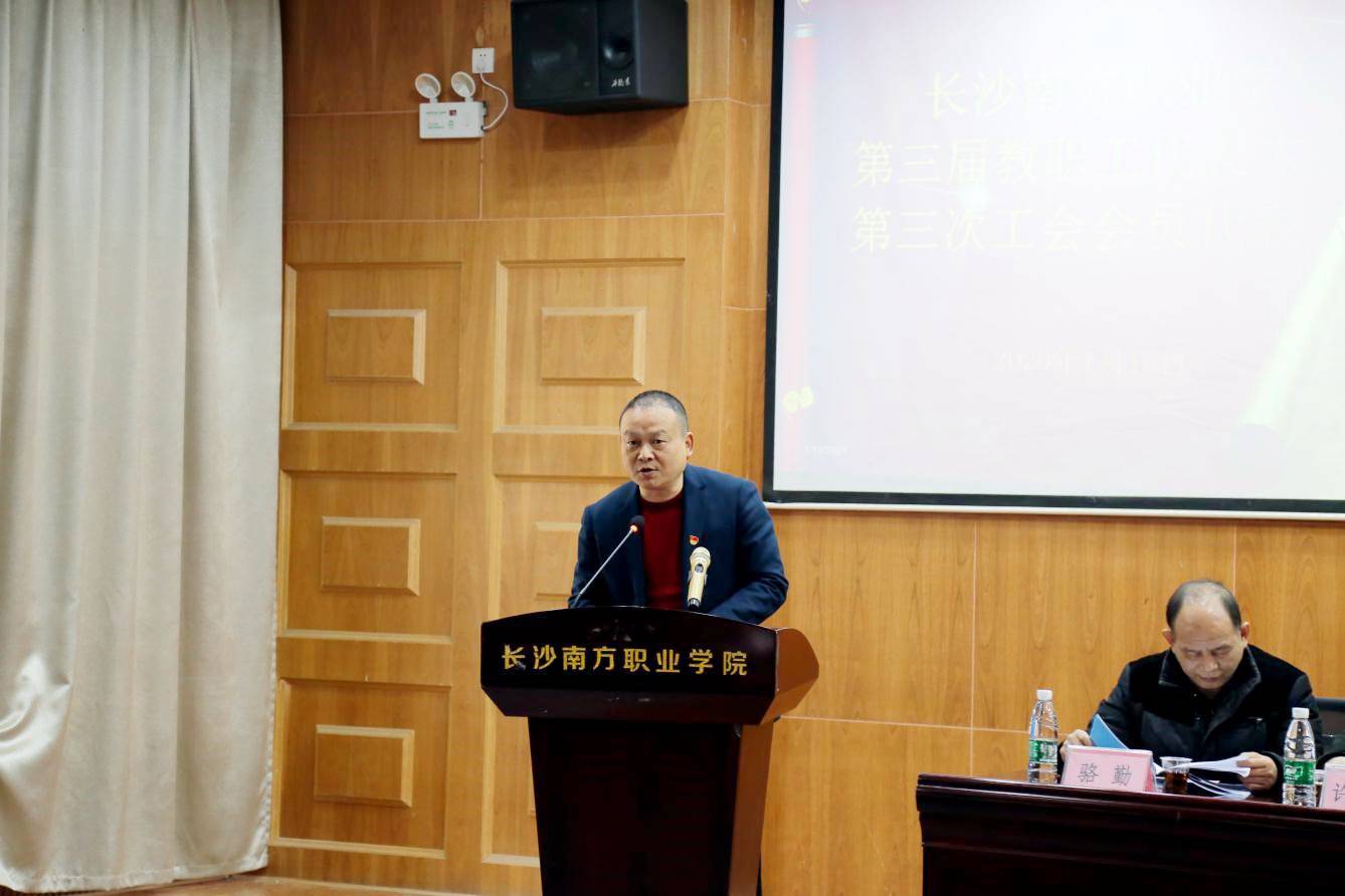 大会现场 预备会上,全体正式代表一致通过大会《代表增替补情况说明》《代表资格审查报告》《大会筹备工作报告》《大会主要议程》《主席团成员名单及工作职责》等文件。 正式大会在庄严的国歌声中拉开序幕。学院党委书记兼政府督导专员任晓晴致辞,代表院党委会向大会召开表示祝贺。就学院工会工作提出加强政策学习,推动教代会工作创新发展;加强自身建设,提升依法治校和民主管理水平;抓好工作落实,开创学院事业发展新局面三点意见。同时勉励大家以此次会议为新起点,坚持以习近平新时代中国特色社会主义思想为指导,深入学习贯彻党的十九大和十九届五中全会精神, 紧紧围绕改革思考问题、谋划措施、协调关系、真抓实干、破解难题,汇聚改革正能量,凝聚发展新共识,抢抓机遇,为建设成特色鲜明的南方职院而努力奋斗! 党委书记兼政府督导专员任晓晴同志致开幕辞 学院院长肖晓春、工会主席肖建伟、财务总监伍珊分别作学院2020年《工作报告》《工会工作报告》《财务工作报告》;工会委员刘中良代表大会主席团报告《征集提案情况说明》。 学院院长肖晓春作年度工作报告 学院工会肖建伟主席作年度工会工作报告 财务总监伍珊作年度财务工作报告 工会委员刘中良报告《征集提案情况说明》 学院工会副主席王建辉致闭幕辞,代表大会主席团对大会的圆满召开表示祝贺,对代表们为学院事业发展积极建言献策的高度责任心与主人翁意识表示感谢,同时建议各与会代表、各单位会后认真学习、落实大会报告内容及领导讲话精神,始终不忘教书育人初心、牢记立德树人使命,为推进学院事业科学发展、为建设成为一流高职院校而不懈努力。 参会人员合影 本次会议既是深化和巩固“不忘初心、牢记使命”主题教育成果的一次盛会,也是加快学院转型发展的一次盛会。将进一步振奋全院教职工工作热情,增强拼搏实干、加快发展的工作意识;统一全院教职工思想认识,提升自身整体素质,成为学院抢抓发展机遇、实现转型发展、铸就新辉煌的新起点。