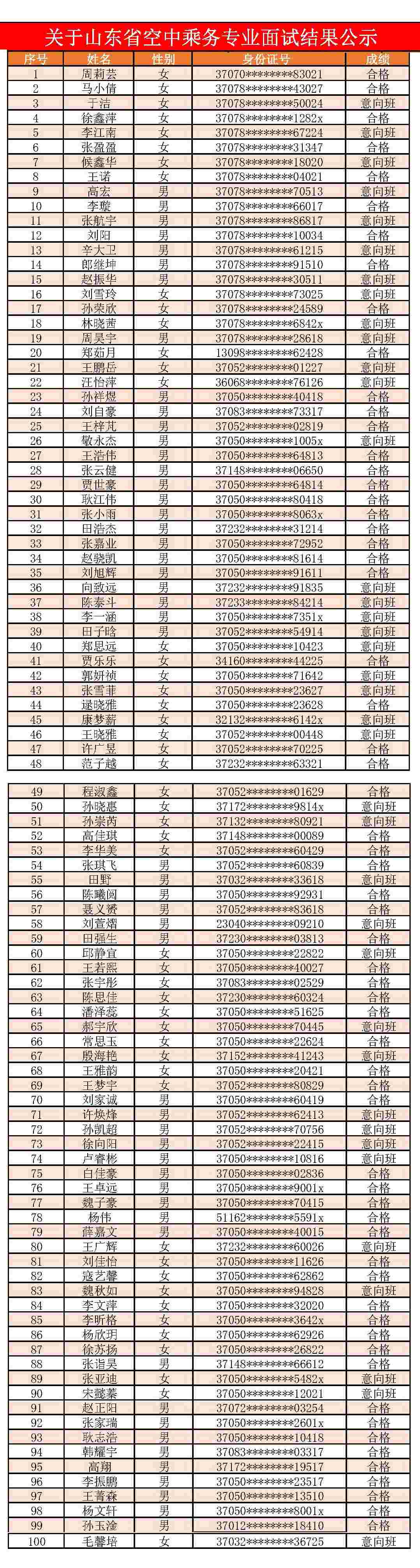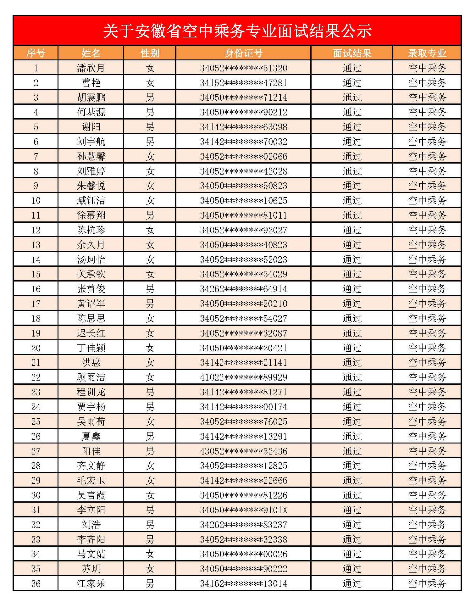 2021年1-3月份,我院分别在山东潍坊、东营、安徽马鞍山进行三场空中乘务专业面试,现将面试合格人员进行公示,名单如下: