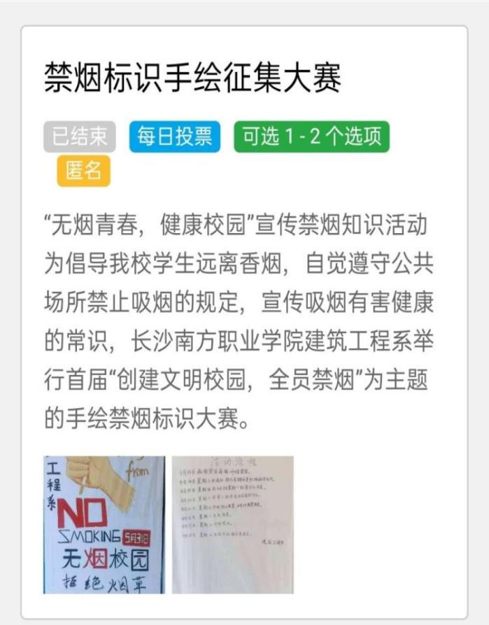 为更好地配合5月31日世界无烟日的宣传, 建筑工程系开展以“无烟校园,师生在行动”为主题的禁烟标识手绘征集活动。旨在使大家充分认识到吸烟的危害,远离香烟,共建文明校园。