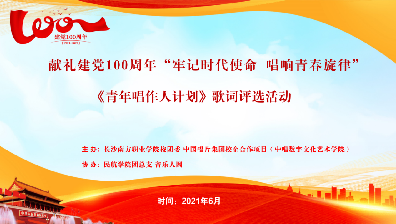 “这是属于我们的时代,梦的方向叫做勇气,这是属于我们的时代,终有一天会成为发光体,我们的梦不该停留在原地.........”为庆祝中国共产党成立100周年,进一步激发广大师生爱党爱国热情,弘扬爱国主义精神,长沙南方职业学院校团委、民航学院团总支及中国唱片集团校企合作项目(中唱数字文化艺术学院)联合开展“牢记时代使命、唱响青春旋律”原创歌曲活动,征集一批展现新时代青年精神风貌的精品力作,以实际行动庆祝建党100周年。