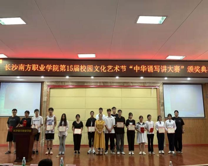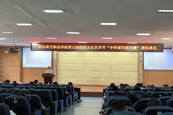 “长沙南方职业学院第15届校园文化艺术节之中华诵写讲大赛”由学院共青团委员会主办,基础教学部承办,在各单位的密切配合下,在广大学生的积极参与下,活动开展有声有色,已于2021年7月完美落下帷幕。有耕耘就有收获,有泥土就会有绿荫。为汇聚学生力量,激发学生热爱中华优秀传统文化的热情,表彰先进,2021年9月22日下午,在学术报告厅隆重举行了“长沙南方职业学院第十五届校园文化艺术节之中华诵写讲大赛颁奖典礼”。本次典礼由基础教学部周健山副主任主持,参加此次典礼的有学工处处长刘文根、院团委副书记夏研、以及各学工处领导、各院部、系部学工处负责人、活动承办单位负责人、指导老师、参赛选手、及各系部代表学生。