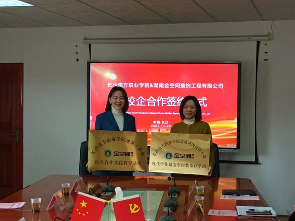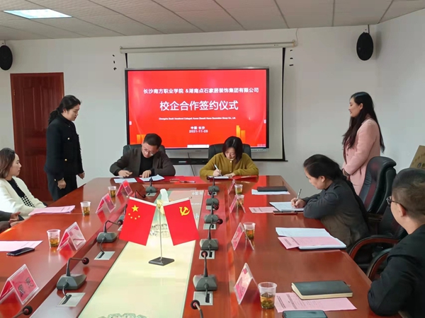 11月25日下午,长沙南方职业学院现代学徒制校企合作签约授牌仪式在8栋419会议室隆重举行。湖南点石家居装饰集团有限公司(下称“点石家装”)人力资源总监方伟、湖南金空间装饰工程有限公司(下称“金空间装饰”)人事经理周思、渠道招聘李祺、学院院院长助理王建辉、招生就业处处长曹永彪、教务处副处长缪学梅、建筑工程系项林主任、彭伟副主任以及陈灿等专职教师参加。签约授牌仪式由建筑工程系项林主任主持。