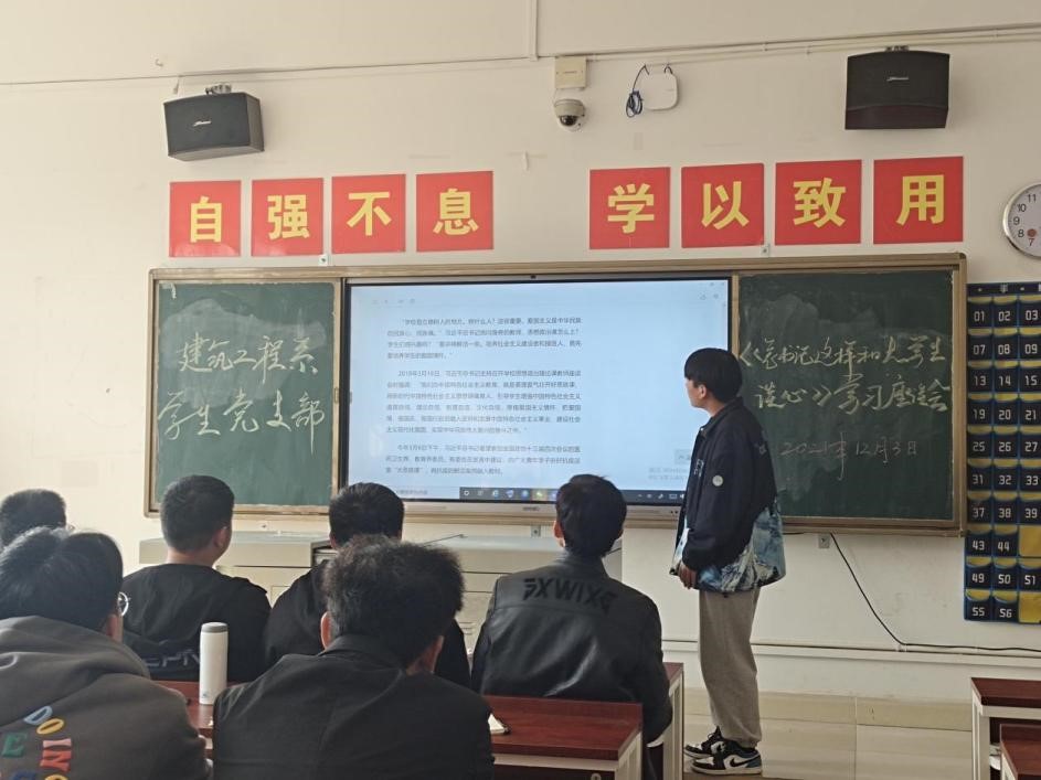 12月3日建筑工程系党总支学生党支部组织全系部分团学干部以及第35期入党积极分子培训班学员60余人,在B308教室举行了《总书记这样和大学生谈心》学习座谈会,学习结束后,四位参会同学代表发了言。学习座谈会由建筑工程系学生党支部书记范波老师主持。