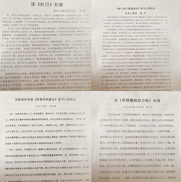 活动的最后,信息工程系党总支倡议所有党员,让读书成为一种习惯、一种追求、一种生活方式,养成日读一小时,月读一本书。在阅读中厚植党员的精气神,倡导争做“悦读党员教师”,争创“书香党支部”,营造爱读书、读好书、善读书的良好氛围。让读书成为了解世界,拓展思维,升华境界的重要途径。品书香盛宴、为人生增色;抒家国情怀,蓄前行力量。