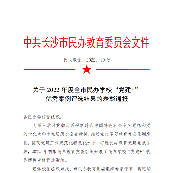 2022年6月28日,在长沙市民办教育党委召开的“喜迎二十大·奋进新征程”党建工作现场推进会上,我院党委报送的党建案例《以党建为引领,奏响民办高职提质培优“奋进曲”》荣获“长沙市民办学校党建+优秀案例”,学院党委被授予 “‘党建+教学实践’先进党组织”荣誉称号。