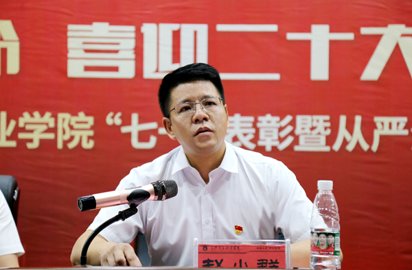 最后,政府督导专员、学院党委书记赵小群代表学院党委,向受到表彰的先进集体和先进个人表示祝贺,向辛勤工作在学校各个岗位上的党员干部致以节日的问候。对学院党的建设、党史学习教育、立德树人、党员先锋模范作用等方面进行了总结。