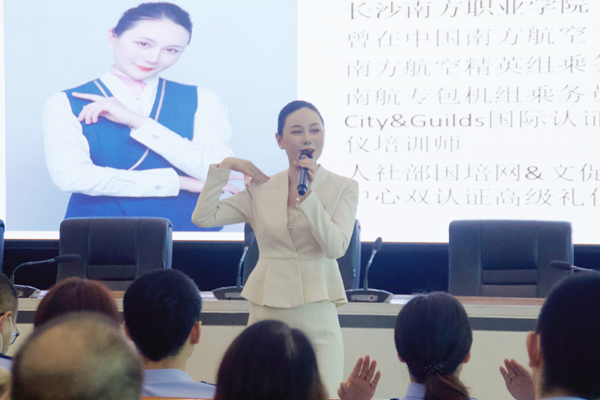 近日,为立足高校服务社会职能,促进高校教育资源辐射社会,结合湖南省空中乘务专业教学团队自身学科与师资优势,民航学院空中乘务专业师生为湖南省长沙监狱警务人员进行了警察公务礼仪培训。此次培训由孙林芳老师主讲,由空中乘务专业曾慧颖、陈湘香、杨莹三名学生进行辅助示范展示。
