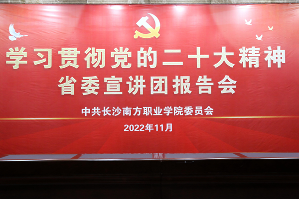政府督导、学校党委书记赵小群主持报告会赵小群要求全校上下,一是在全面学习、全面把握、全面落实上狠下功夫,持续兴起学习宣传贯彻党的二十大精神的热潮。要在学习领会上入脑入心,做到领导带头学、全员覆盖学、融会贯通学,更加深刻领悟“两个确立”的决定性意义,更加自觉地衷心拥护“两个确立”、忠诚践行“两个维护”,始终在思想上政治上行动上同以习近平同志为核心的党中央保持高度一致。二是全方位、多角度、立体式深入宣传学习贯彻党的二十大精神,紧密结合学校教育事业工作实际,引导广大党员干部、员工全面贯彻党的教育方针,牢记为党育人使命,落实立德树人根本任务,努力办好人民满意的教育。广大教师要常筑信仰之基,常润为师之德,常修善教之本,常怀仁爱之心,当好传播知识、传播思想、传播真理的“经师”,当好塑造灵魂、塑造生命、塑造新人的“人师”,努力成为学生的知心朋友和人生导师。三是在贯彻落实上见行见效,把学习宣传贯彻党的二十大精神与习近平总书记对湖南重要讲话重要指示批示精神结合起来,与“三高四新”战略定位和使命任务结合起来,与“强省会”战略结合起来,在推动学校高质量发展上勇闯新路,在统筹发展和安全上不放松,在加强党的建设上争先创优,奋力谱写长沙南方职业学院教育事业发展新篇章。