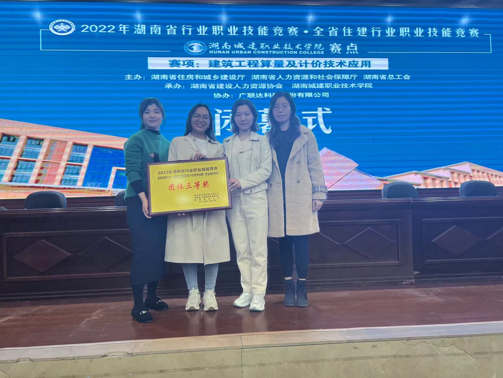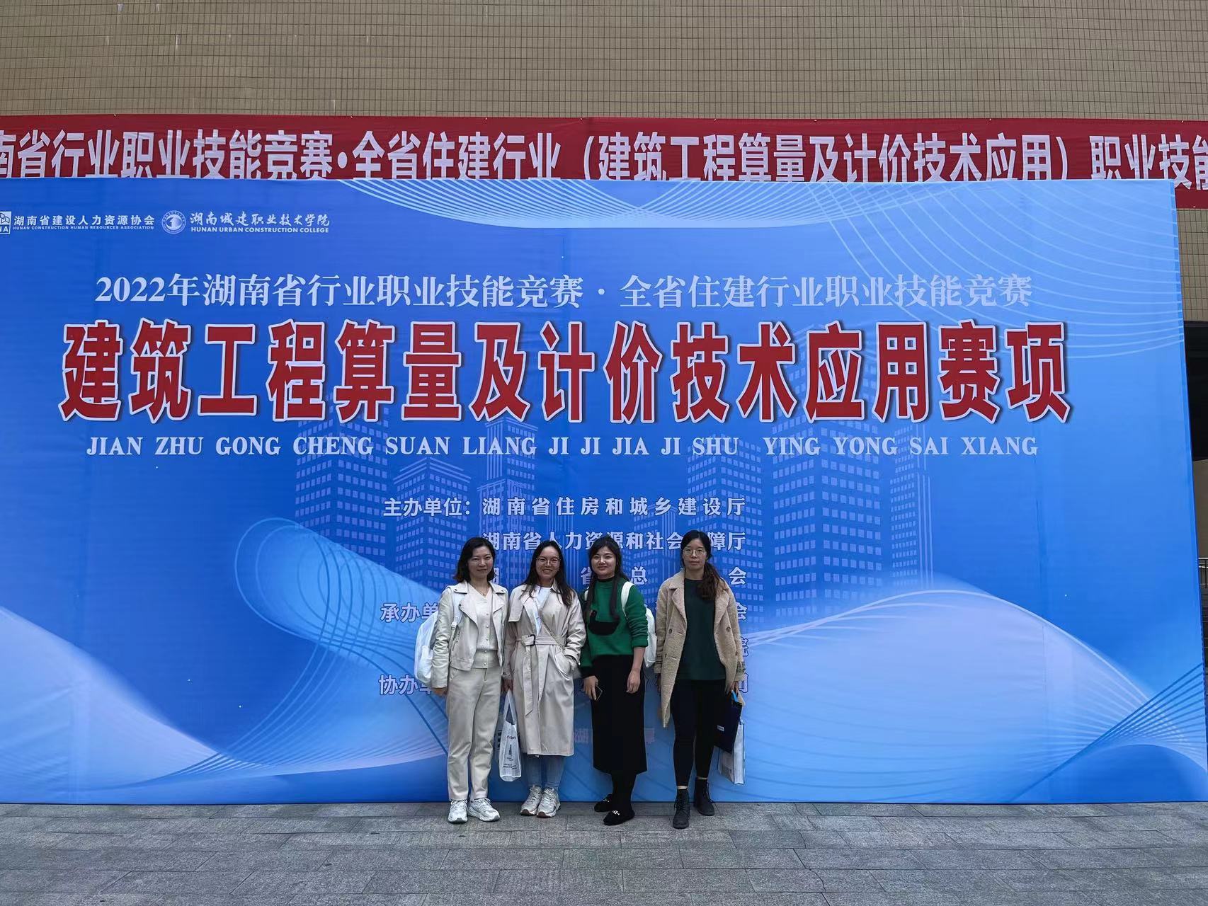 为贯彻落实习近平总书记对技能人才工作的系列重要指示精神,大力弘扬劳模精神、劳动精神、工匠精神,激发和调动住建行业技能人才努力钻研技术,熟练掌握职业技能,走岗位成才道路,加快培养和选拔大批适应我省住建行业转型升级发展所需要的高素质技能人才,为实现“三高四新”战略、建设富饶美丽幸福新湖南提供人才保障。2022年11月25至26日由湖南省住房和城乡建设厅、湖南省人力资源和社会保障厅、湖南省总工会主办,湖南省建设人力资源协会、湖南城建职业技术学院承办的2022年湖南省行业职业技能竞赛 ·全省住建行业建筑工程算量及计价技术应用赛项的竞赛,建筑工程系工程造价专业教师叶蓓、易彬、李思思、李艳四位教师代表学院参加了此次竞赛,经过两天三场考试(理论考试+手算+软件)的激烈角逐,荣获团体三等奖。