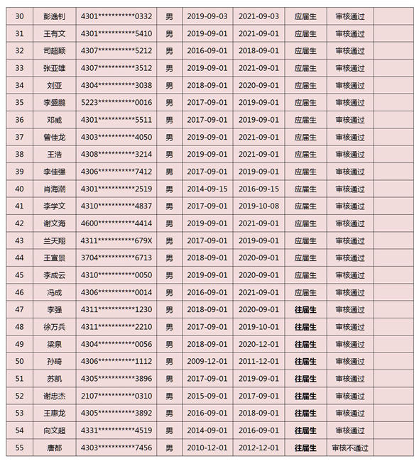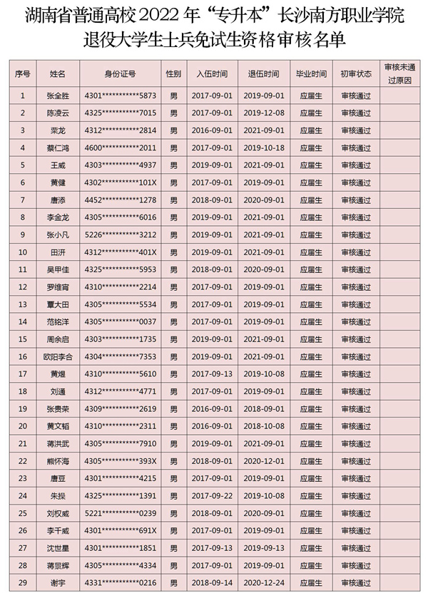 根据《2022年湖南省普通高等学校专升本考试招生工作实施方案》(湘教发〔2022〕3号)规定,现将参加2022年湖南省普通高校专升本招生考试申请退役大学生士兵免试的考生资格初审结果予以公示。我院共55人提交了2022年普通高等教育“专升本”退役大学生士兵免试生资格审查申请表。经审查,共确认54名学生具有退役大学生士兵免试生资格,现将审查名单予以公示。如有异议,请于公示期内联系,电话0731-88121878,13787784899。