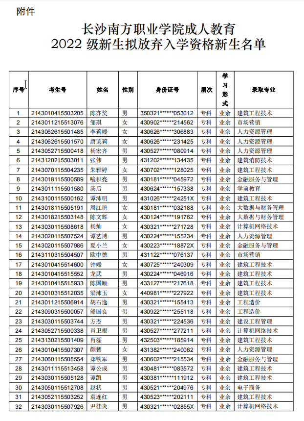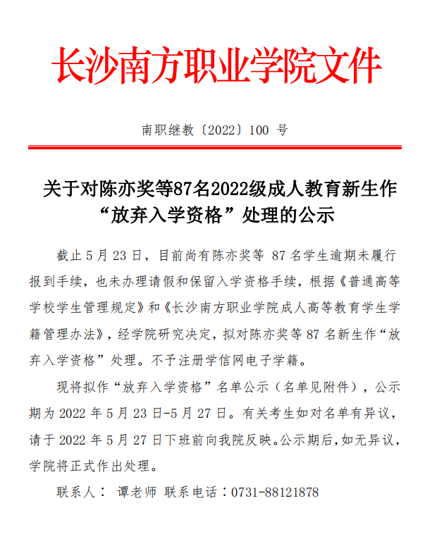 关于对陈亦奖等87名2022级成人教育新生作 “放弃入学资格”处理的公示