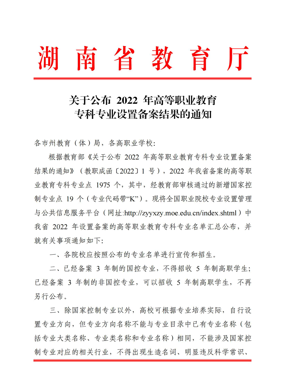 根据教育部《关于公布2022年高等职业教育专科专业设置备案结果的通知》(教职成函〔2022〕1 号)及湖南省教育厅《关于公布2022年高等职业教育专科专业设置备案结果的通知》,现就我院2022年设置备案专科招生专业公布如下: