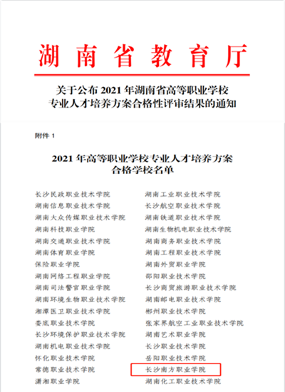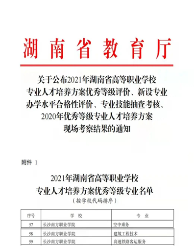 近日,湖南省教育厅公布了2021年高职高专院校专业人才培养方案合格性评审以及优秀等级评价评审结果,长沙南方职业学院25个申报专业全部合格,空中乘务、建筑工程技术、高速铁路客运服务3个专业获得“优秀”等级。我院2020年已有建筑室内设计、金融管理2个专业获评“优秀”,2021年再结硕果,彰显了我院专业建设取得新的成效。