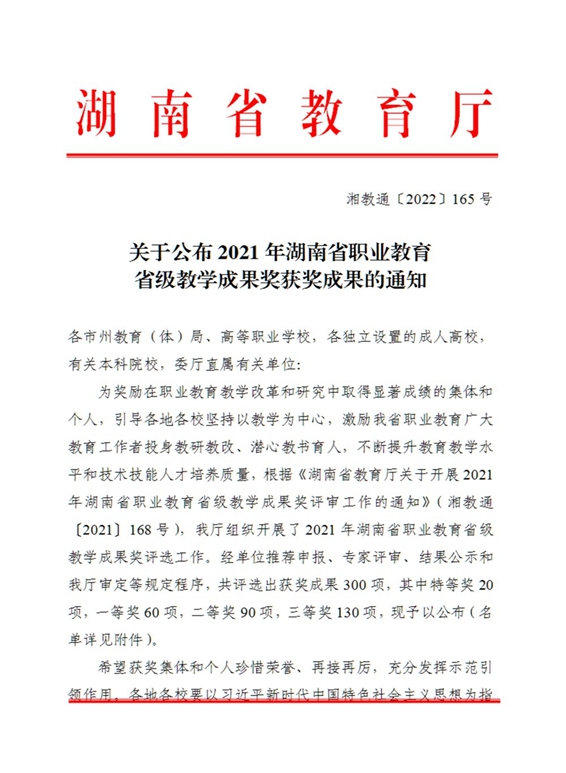 根据省教育厅发布的通知显示,2021年湖南省职业教育省级教学成果奖,共评选出获奖成果300 项(含中高职),其中特等奖20项,一等奖60 项,二等奖90 项,三等奖130 项。我院此次推荐申报的3个项目全部获奖,获奖数量创历史新高。这是学院多年来始终坚持教学改革、教师们潜心耕耘所取得的喜人硕果,未来希望各项目团队再接再厉,争取再创佳绩。