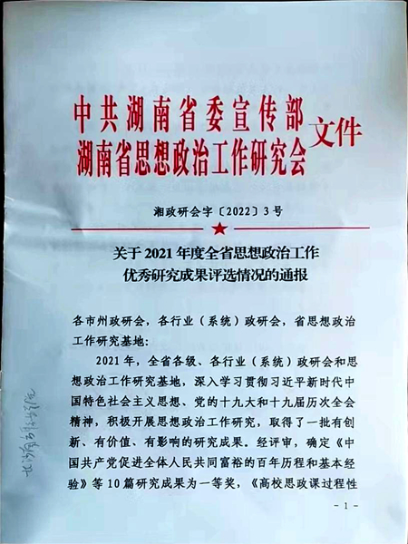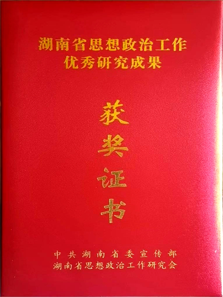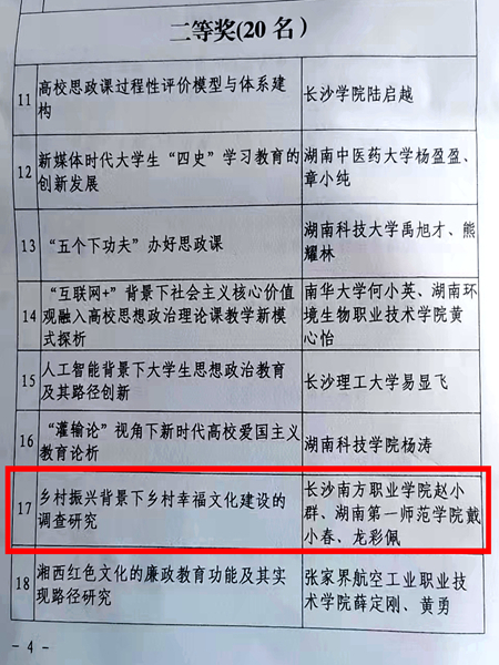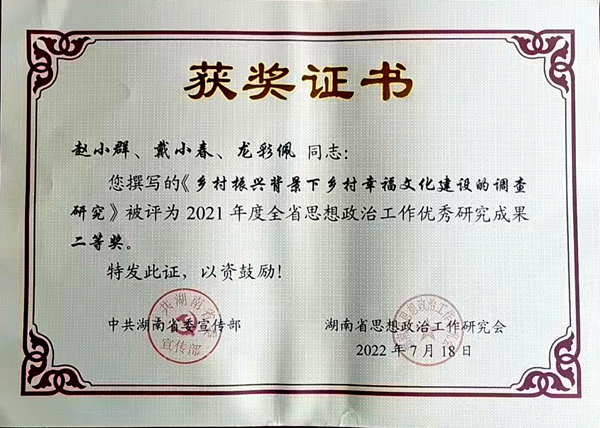 (文/图 党委办公室 宣传部)2022年7月18日,省委宣传部、省思想政治工作研究会公布了2021年度全省思想政治工作优秀研究成果获奖名单,长沙南方职业学院党委书记赵小群主持申报的《乡村振兴背景下乡村幸福文华建设的调查研究》获评二等奖研究成果。