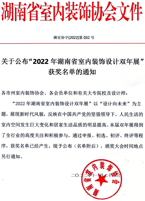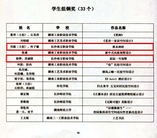 为更好地反映在党的坚强领导下,人民生活的室内空间发生的巨大变化和居家生活品质的明显提高,以崇尚人文设计,绿色设计,展现时代新风貌,弘扬湖湘设计精神。湖南省室内装饰协会组织举办了“设计向未来”暨2022年湖南省室内装饰设计双年展,大赛共收到专业组和学生组作品620幅,565幅作品(其中专业组390幅、学生组175幅)初审入围。经大赛组委会专家评委综合评审,学生组评选出金奖13个、银奖21个、铜奖33个,我校4支参赛队全部获奖。