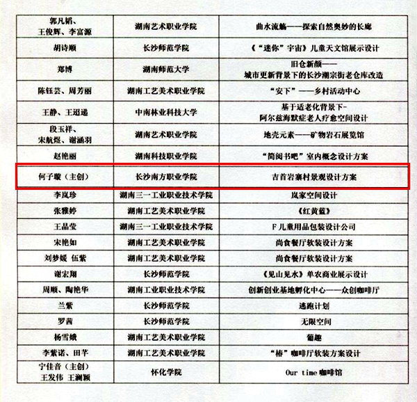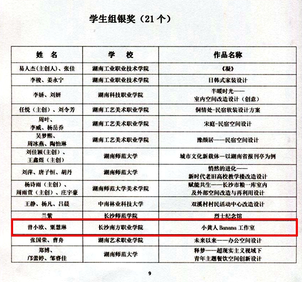 11月23日,据湖南省室内装饰协会官网《关于公布“2022年湖南省室内装饰设计双年展”获奖名单的通知》显示,我校建筑室内设计专业曾小欧等6名学生组成的4支参赛队在全省本科、高职院校作品同台对决中,摘得1银3铜,成为本次双年展备受瞩目的优胜院校。