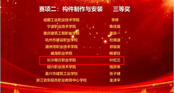 据悉,该赛事由中华人民共和国住房和城乡建设部人事司指导,中国建设教育协会主办。此前在11月举办的湖南省第五届装配式建筑职业技能大赛上,我校建筑工程系学生张录云、叶虹兰获得装配式构件制作与安装赛项三等奖,成功入围国赛。