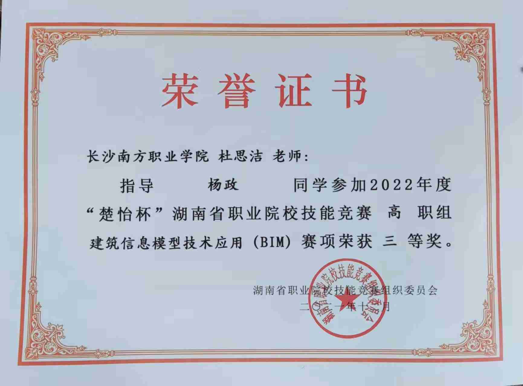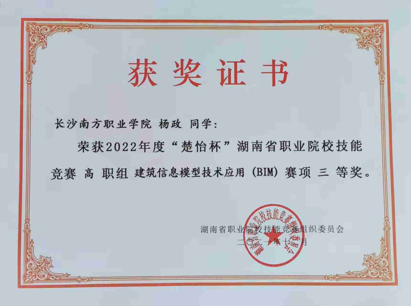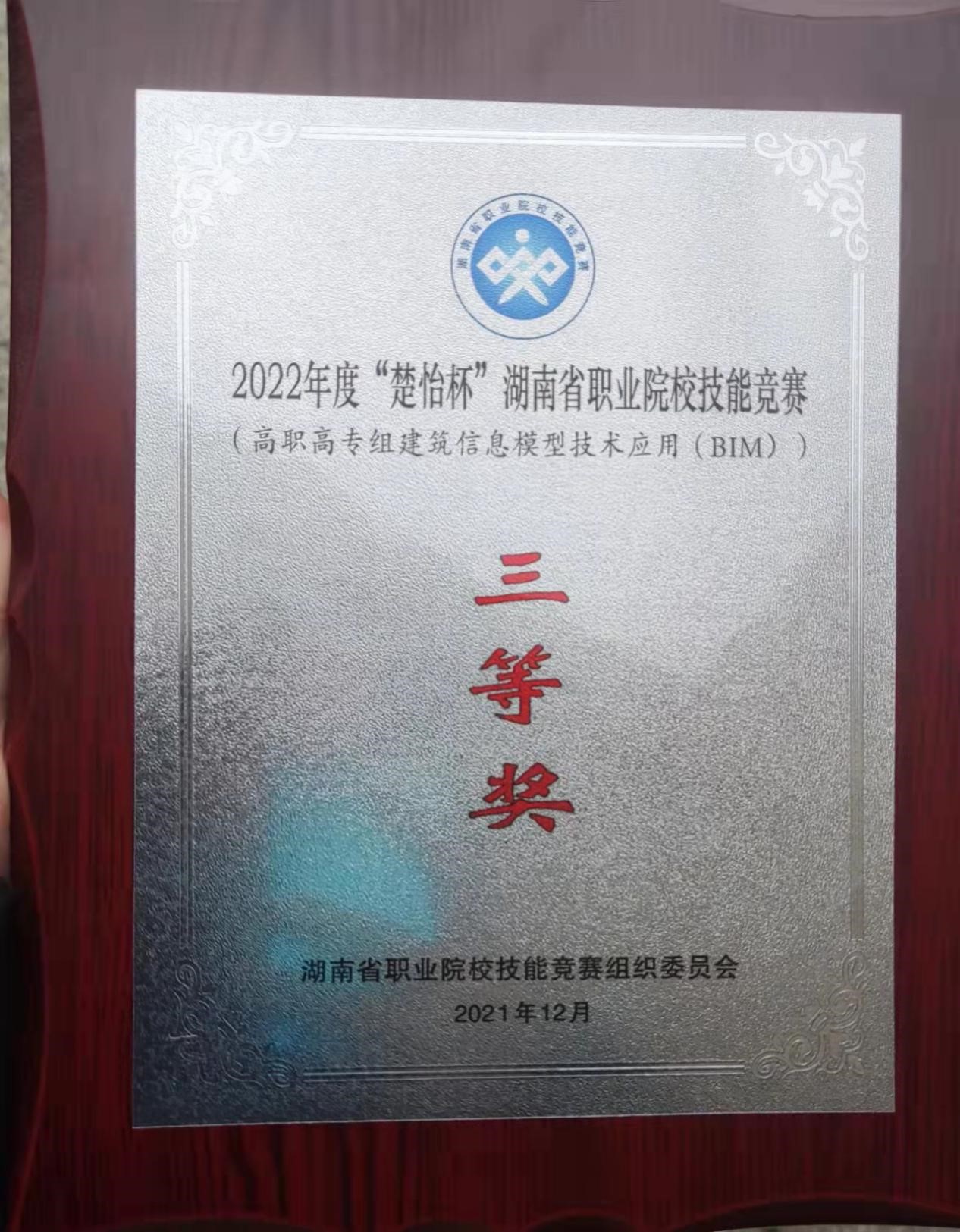 2021年12月31日,2020年度“楚怡杯”湖南省职业院校技能竞赛在湖南城建职业技术学院落下帷幕。经过紧张激烈的技能比拼及赛后专家的评审,建筑工程系杨政同学在本次技能竞赛中荣获建筑信息模型技术应用(BIM)三等奖。