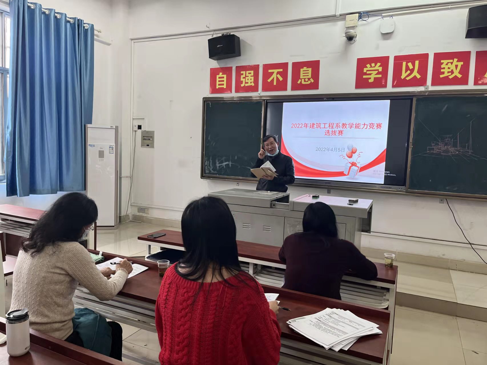 2022年4月5日下午建筑工程系在B栋308举办了建筑工程系教师教学能力竞赛选拔赛。全系专职教师和行政人员近40人参加此次活动。竞赛评委由教务处督导办两位曾教授、建筑工程系项林主任和经济管理系黄晶老师担任。