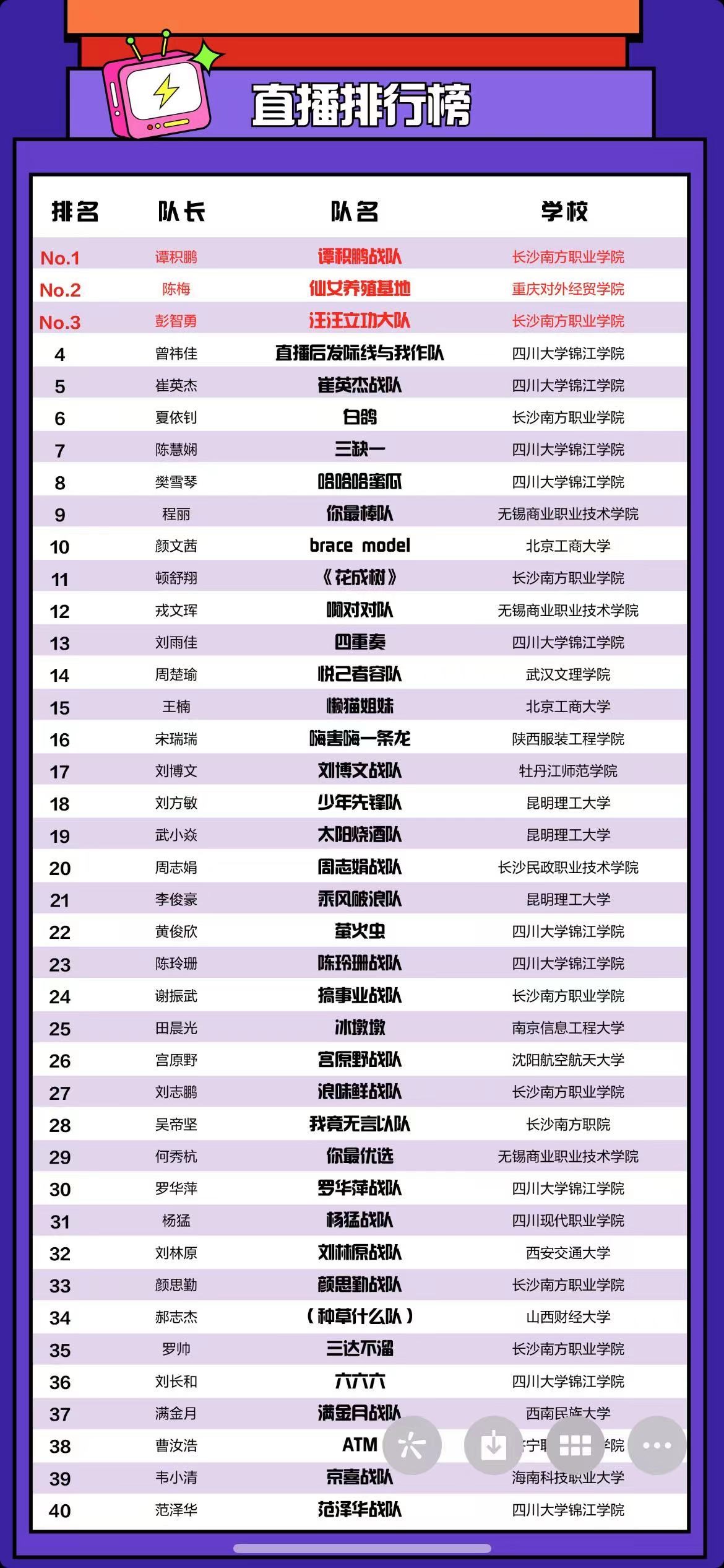 经过近一个月紧张、激烈的比赛,京东“花YOUNG计划”直播大赛第二季海选赛落下帷幕,全国赛区的榜单随之出炉,本次全国赛区统计前40名,我校共有9支队伍入榜,其中谭积鹏、彭智勇、夏依钊三支队伍进入前10名,谭积鹏战队更是获得了全国赛区海选赛第1名的好成绩!选手们努力付出有了回报。