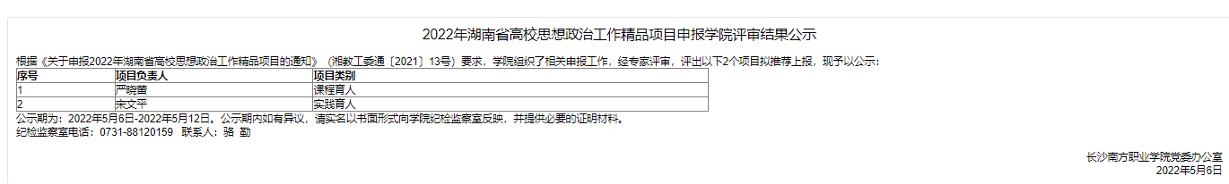 职业教育改革发展需要各专业紧跟社会行业需求对接产业结构探索职教新模式。各教研室专业教师不断总结经验,形成职业教育改革发展重要成果。其中电子商务教研室黄国芳老师的“产教融合、岗课赛证、校企合作”谋发展的电子商务专业人才培养实践模式和软件教研室宋文平老师的源代码”工作室让南方学子梦想成真等优秀案例通过系部推优提交学院,向其他专业推广经验。其中,我系宋文平教师获得2022湖南省高校思想政治工作精品项目的推荐。