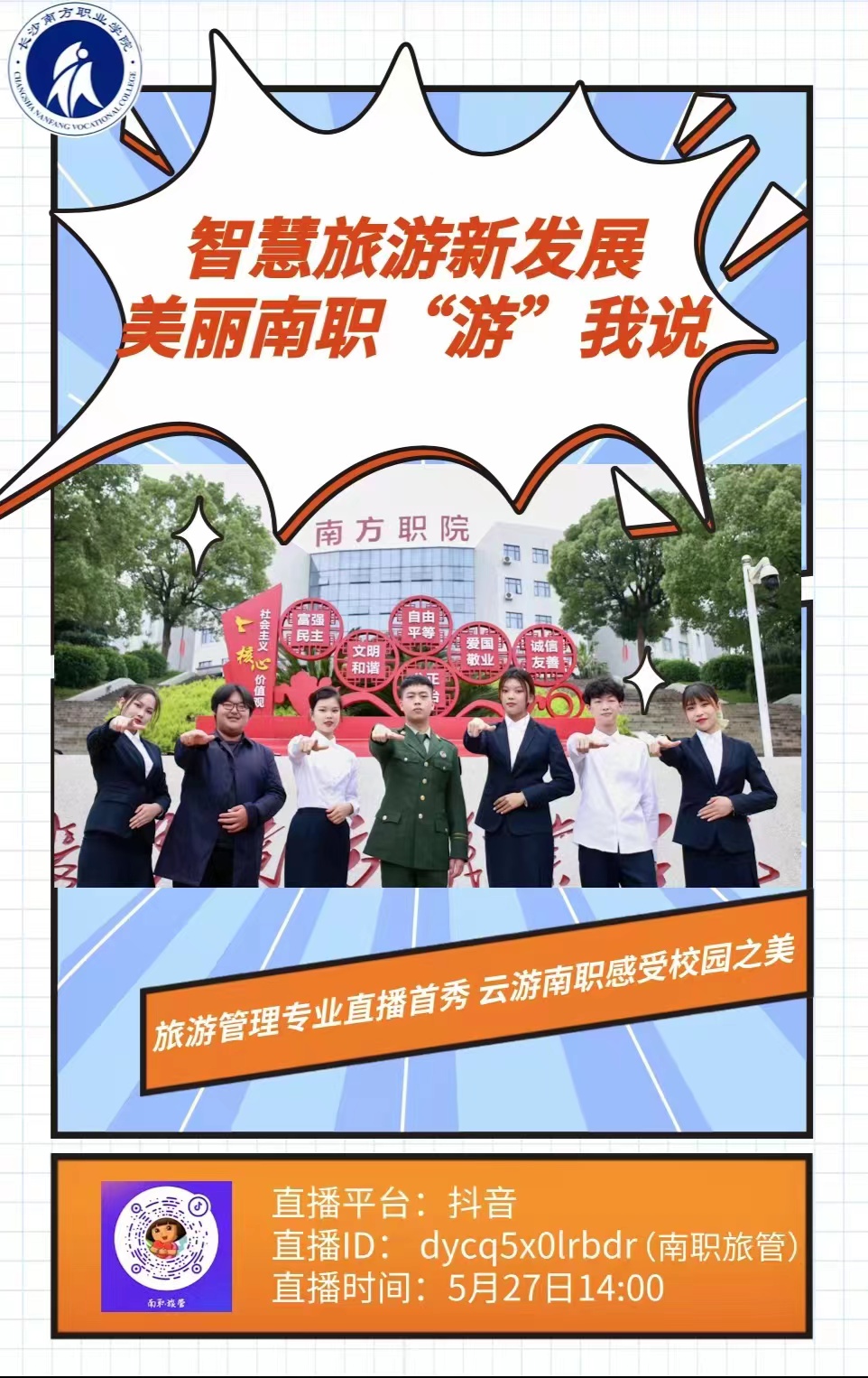 欢迎大家关注民航学院旅游管理抖音号“南职旅管”,5月27日下午14:00我们云端见。