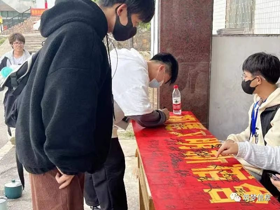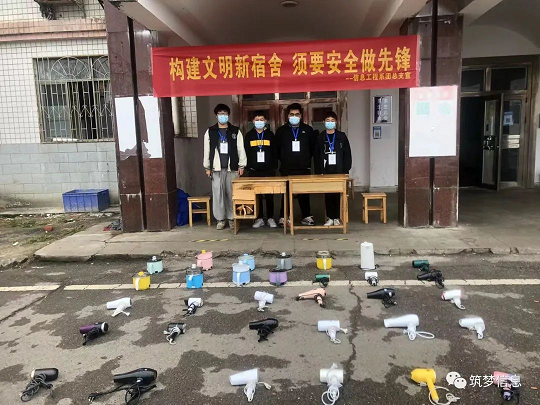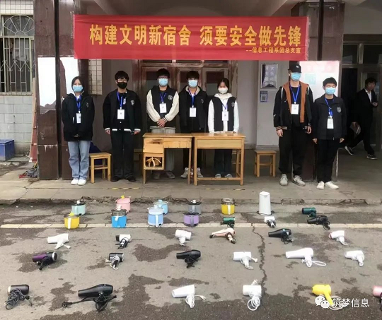 信息工程系团学会成员们在五栋宿舍楼将查寝缴获的违规电器进行展示,摆放整齐,把横幅摆放好,路过的同学们纷纷在横幅上签字留念,表达对本次活动的支持。