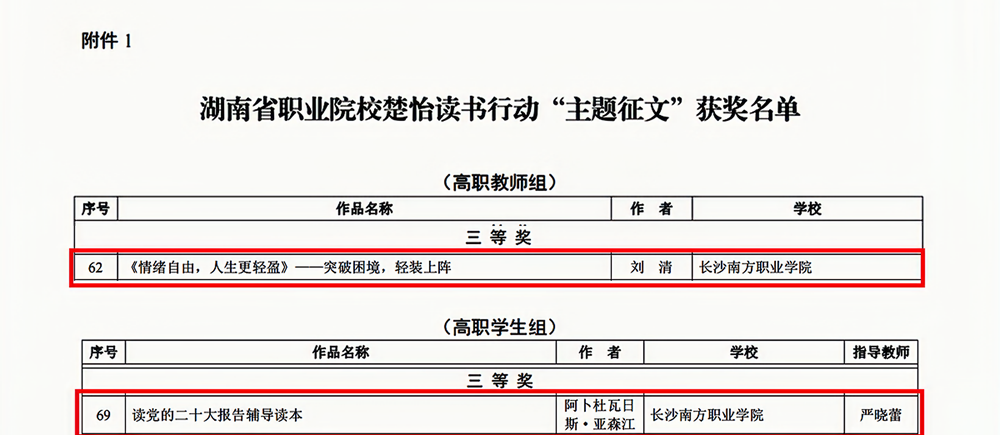 日前,湖南省教育厅《关于公布湖南省职业院校楚怡读书行动“主题征文”“楚怡读书之星”“最佳组织奖”评选结果的通知》(湘教通〔2023〕241号)显示,我校教师刘清、学生阿卜杜瓦日斯·亚森江分别获“主题征文”高职教师组、高职学生组三等奖。