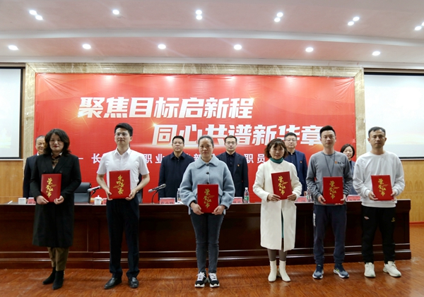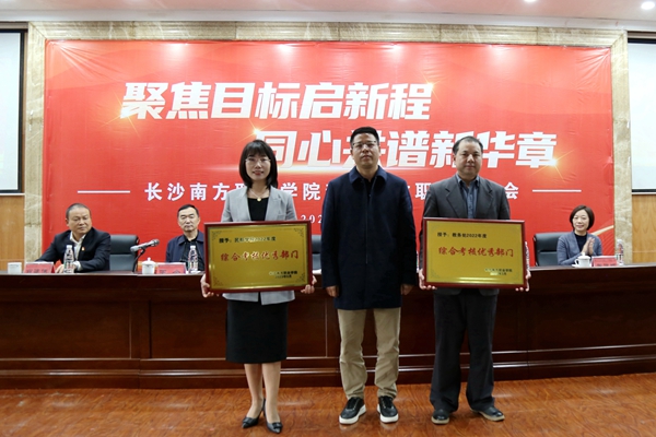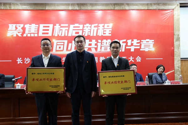 党委副书记、校长肖晓春作工作报告并部署工作副校长王金宣读学校2022年度先进表彰文件。校领导为受表彰的先进单位授牌,为受表彰的先进个人颁发证书。
