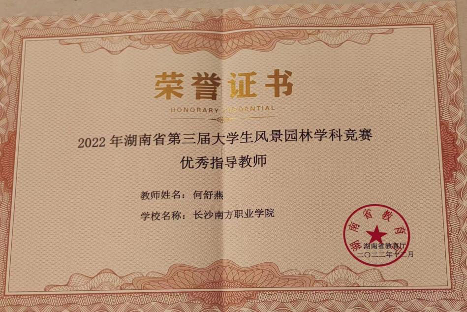 何舒燕,湖南南县人,副教授,工艺美术师。在湖南省皮革集团公司设计室工作了近11年,在长沙南方职业学院任专职教师18年,一直在艺术设计,室内设计课程专业建设、课程教学一线,坚持爱心化人,耐心树人,匠心育人。先后获得湖南省优秀指导老师、学院优秀教师、湖南省职业院校技能竞赛优秀指导教师等荣誉称号。指导学生参加湖南省2022年园林设计学科竞赛获得一等奖,获省优秀指导老师。
