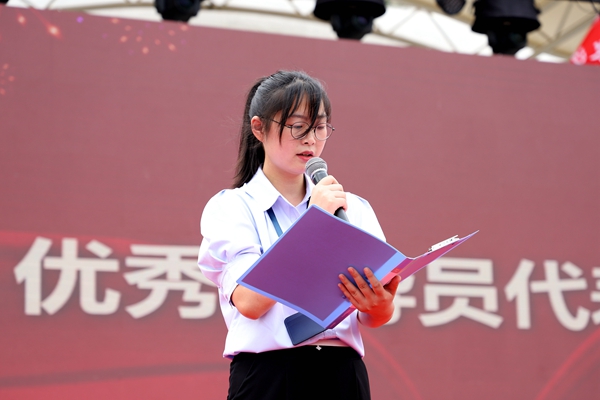 来自民航学院高速铁路客运服务2-2303班向何泽作新生代表发言。她与同学们共勉:始终心怀梦想,敢于迎接挑战,循梦而行,向阳而生。始终相信自己,坚定理想信念,勇敢面对困难,不断追求卓越。不负青春,不负韶华,让青春的身影去丈量校园的每一处风景,用奋斗的汗水去妆点美丽校园,以优秀的成绩回报老师的教诲,让大学生活过得充实而有意义。潜心求学,苦练本领,努力使自己成为栋梁之材,为家乡、为社会贡献出自己的一份力量!