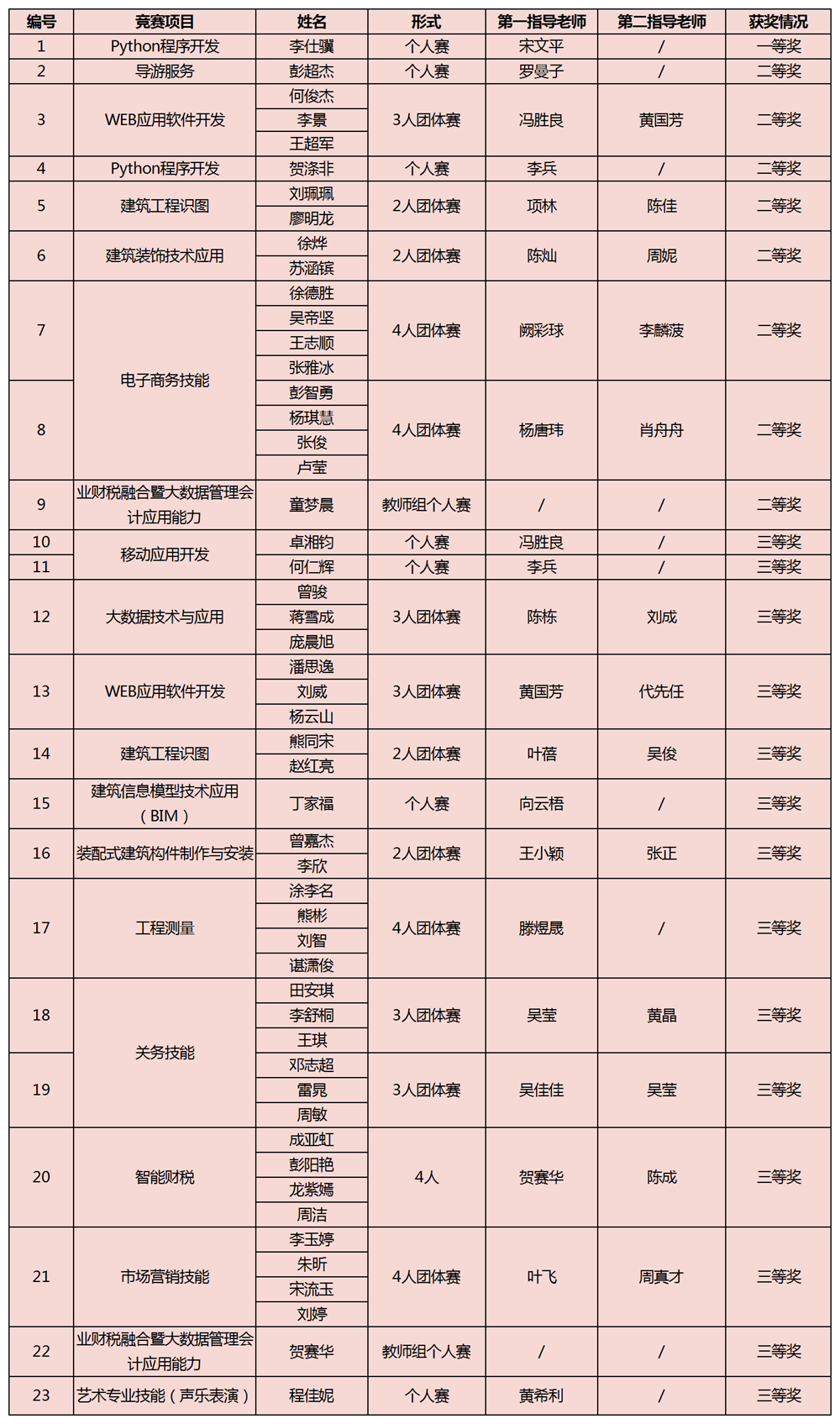 赛前学校进行了多轮部署和动员,各代表队认真组织了培训,指导老师与选手们克服了疫情期间的种种困难,通过拟赛锻炼选手的应变能力,培养选手赛场上良好的心理素质,并利用寒假期间分赛项采用线上+线下模式进行备赛训练。比赛中参赛选手沉着应战,努力展示,经过激烈角逐,斩获一等奖1项,二等奖8项,三等奖14项(含2022年度第二阶段赛项1个),再次取得丰硕成果!获奖名单如下: