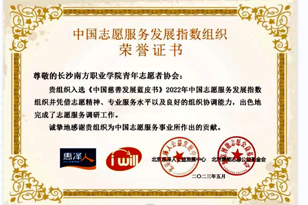 近日,我校青志协凭借出色的志愿服务工作,获得北京惠泽人公益发展中心、北京博能志愿公益基金会联合颁发的“中国志愿服务发展指数组织”。