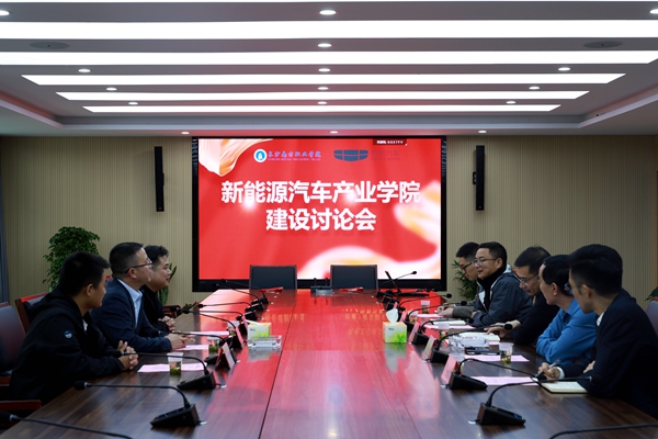 会议现场王庆云、刘磊分别介绍双方与会人员,并就前期合作情况进行简要汇报,双方就新能源汽车产业学院组织架构、建设内容等方面展开讨论。
