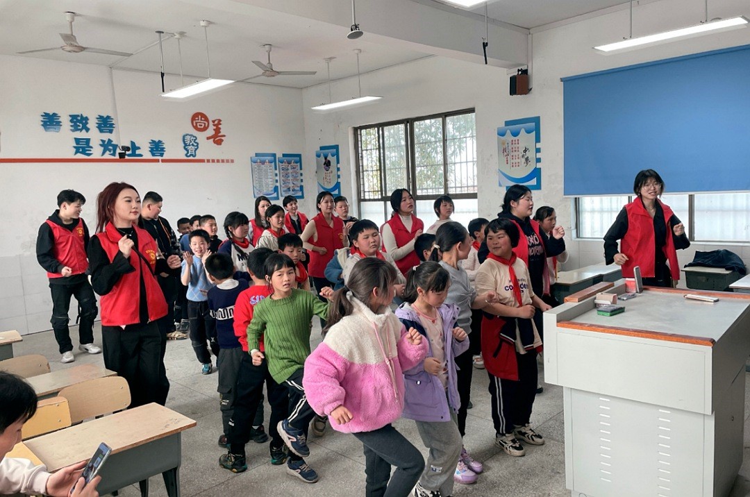 结束孤寡老人慰问活动后,志愿者们又前往三桥村当地的小学看望留守儿童。为小朋友们带去了学习用品以及体育用品。志愿者们带领着小朋友们玩游戏、唱歌跳舞,小朋友们积极踊跃参与各项活动,校园里充盈着欢声笑语。