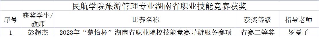 3月5日,2023年度“楚怡杯”湖南省职业院校技能竞赛高职组导游服务赛项在怀化职院落下帷幕。民航学院旅游管理2-2001班彭超杰同学获二等奖。