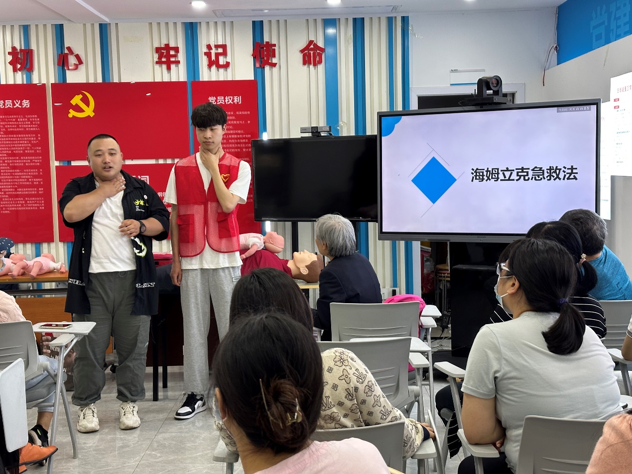 活动第一阶段先由团队讲师讲解CPR和海姆立克急救法,从理论角度让现场社区居民了解基本的急救技能知识;第二阶段开展实践操作,团队学生分组指导到场居民,将理论知识与实际操作相结合,让急救技能入脑入心。