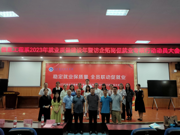 为深入学习贯彻落实党的二十大精神和国务院及省委、省政府“稳就业”“保就业”的决策部署,按照学院2023年就业质量年建设方案的要求,信息工程系在学术报告厅召开了2023年就业质量建设年暨访企拓岗促就业专项行动动员大会。学校副校长吴涛、肖建伟出席,招生就业处副处长谭泽良,信息工程系主任李兵及师生代表参加此次活动。