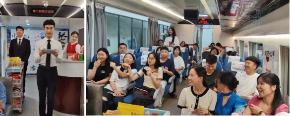 座无虚席的车厢内,乘务员带领全体“旅客”齐诵《沁园春?长沙》,共同缅怀一代伟人毛泽东。湖湘文化知识抢答赛更是将“旅客们”的现场气氛带入新的高潮。“三湘四水”指什么?湖南最后通高铁的城市是哪个?“屈贾之乡”“朱张会讲”是指谁?我国第一个国家森林公园是哪个……《空铁旅游地理》课程上的知识点既是一种特别形式的课程复习,也让学生进一步将湖湘文化内化于心。