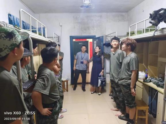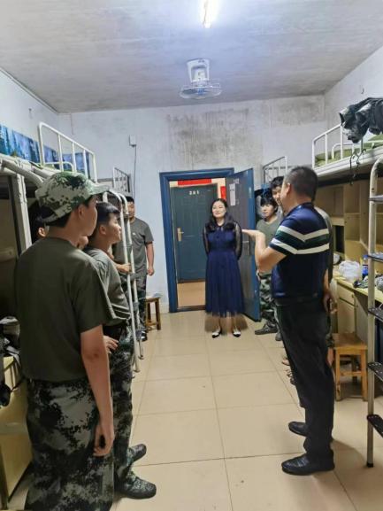 在新生宿舍里,项林主任亲切地询问每一位新生的情况,询问他们是否想家,是否适应军训等,在了解到有学生来自于海南、安徽、四川等地后,项林主任叮嘱他们要经常和家长沟通,多和家里报平安,同时一定要注意安全,有任何问题要及时向教官和辅导员老师反映。