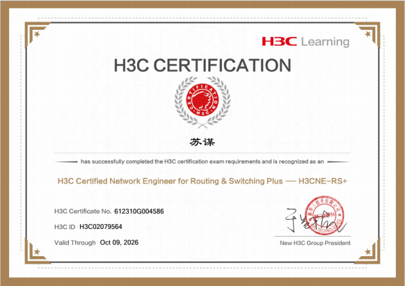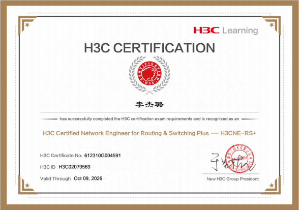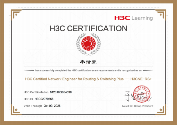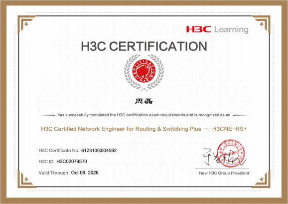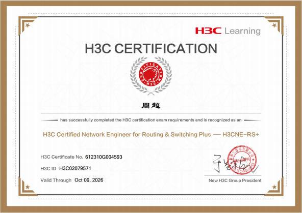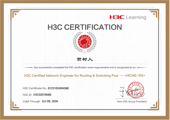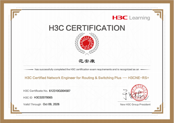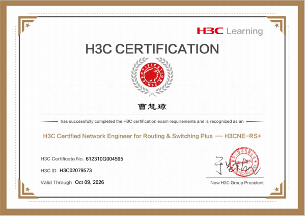 2023年10月8日,信息工程系计算机网络专业开展了网络工程师(H3CNE-RS+)的考试,首批考试共有21名同学顺利的通过了考试并获取了该证书。