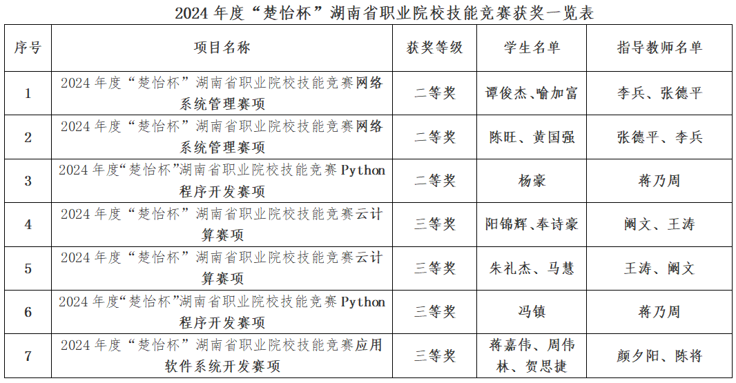 2023年11月30日至2023年12月10日,长沙南方职业学院信息工程系参赛师生在2024年度“楚怡杯”湖南省职业院校技能竞赛各赛项中奋力拼搏、激烈角逐,在网络系统管理等4个赛项中斩获7项奖项,其中二等奖3项,三等奖4项。