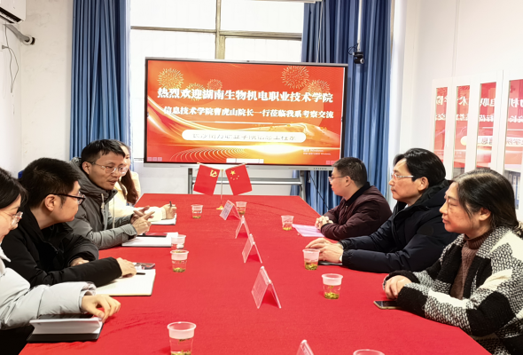 12月19日,湖南生物机电职业技术学院信息技术学院院长曹虎山、副院长高建华一行6人来我校信息工程系考察交流。信息工程系主任李兵、副主任龚鹏携专业教研室主任热情接待,双方就专业人才培养方案制定、技能竞赛、师资培训等方面进行深入交流对接。